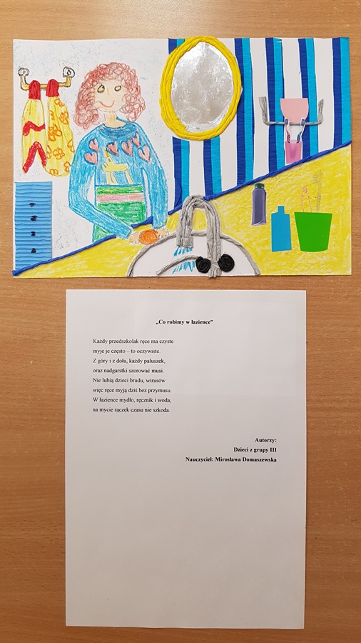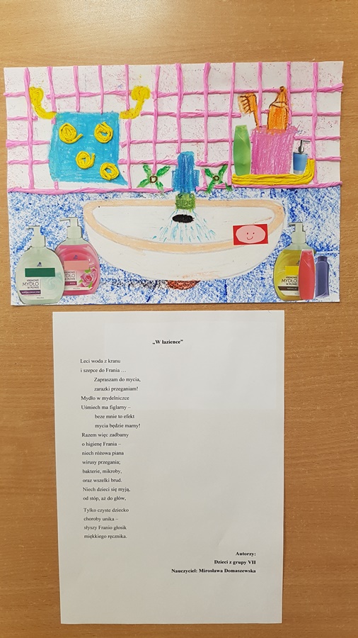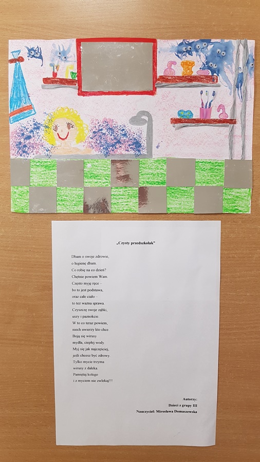 Jak ważna jest higiena całego ciała dla zachowania zdrowia nikogo w przedszkolu nie trzeba przekonywać. Dzieci znają zasady higieny i utrwalają prawidłowe nawyki higieniczne przy każdej okazji. Dzieci z grupy III i VII podzieliły się swoją wiedzą i doświadczeniami w tym zakresie „artystycznie”. Napisały z pomocą nauczyciela wiersze propagujące higienę ciała, a do każdego z nich wykonały pracę plastyczną ilustrującą treść. Prace zostały wysłane na konkurs poetycko-plastyczny „O higienę dbamy , wirusy przeganiamy” zorganizowany przez Przedszkole Nr 39 z Oddziałami Integracyjnymi w Rybniku.