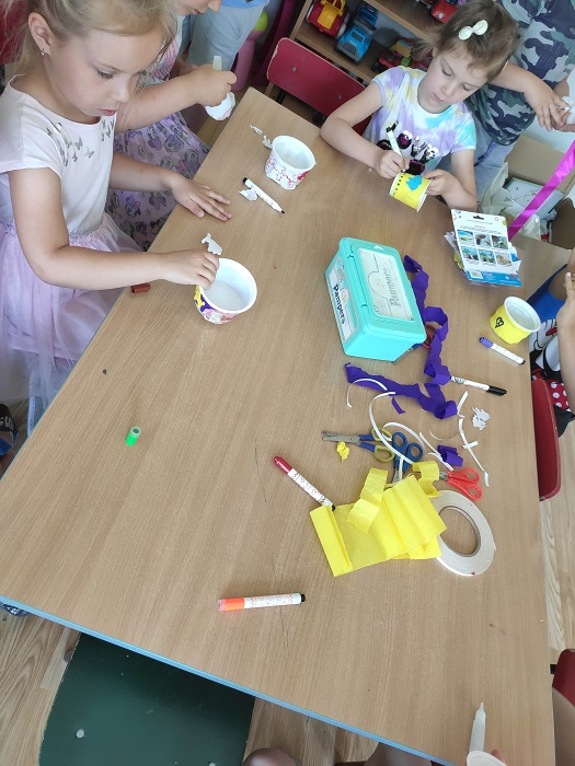 Uczestnicy zajęć wg własnych pomysłów ozdobili plastikowe kubeczki po jogurtach i wykorzystali je jako doniczki, w których zasiali kwiaty.