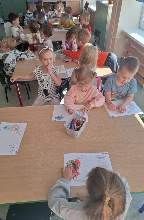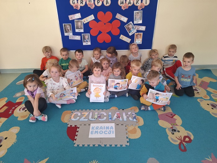 Grupa „Maki” podczas zajęć z projektu edukacyjnego „Czuciaki” – w krainie emocji, poznała pierwszą emocję – radość.