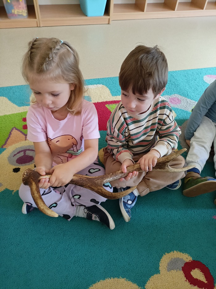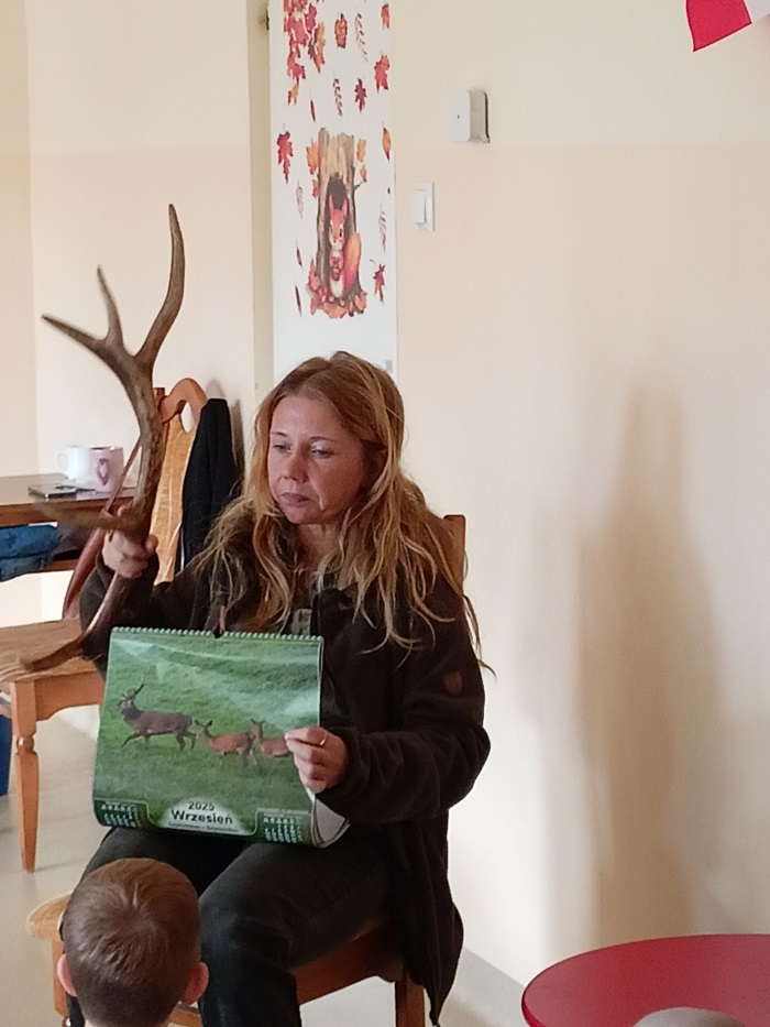 W dniu 13. 10.2025 r. w naszym przedszkolu gościliśmy Panią Leśnik z Nadleśnictwa Rudka. Celem spotkania było zapoznanie dzieci z pracą leśnika. Przedszkolaki dowiedziały się wielu ciekawych rzeczy na temat zwierząt i ptaków żyjących w środowisku leśnym. Największe zainteresowanie wśród wszystkich dzieci wzbudziło poroże jelenia, które przedszkolaki miały okazję obejrzeć , a nawet dotknąć.