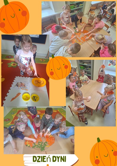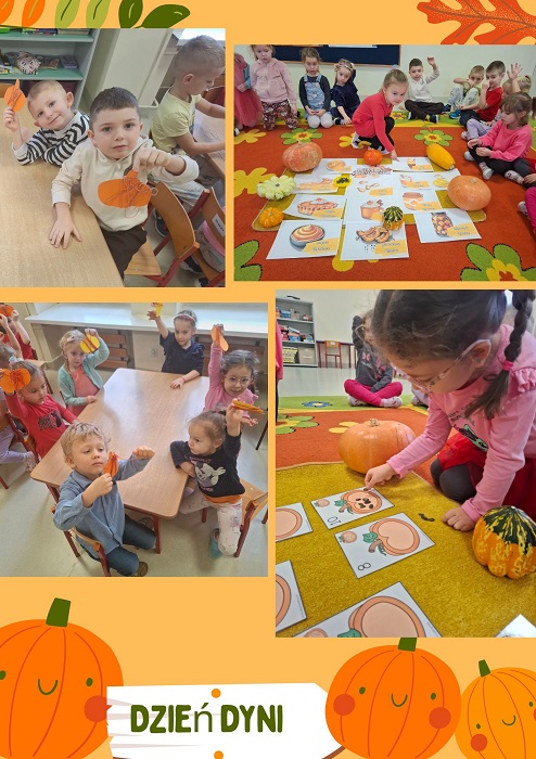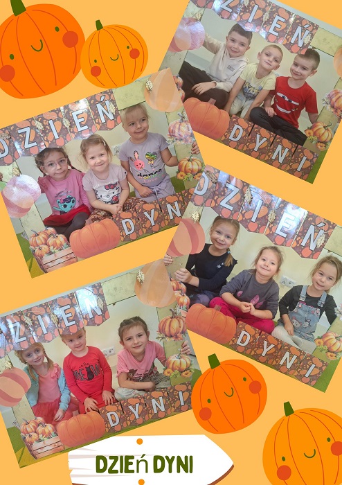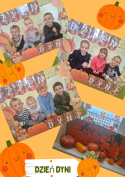 W piątek grupa „Różyczki ” obchodziła Dzień dyni. Przedszkolaki poznały różne rodzaje dyni, jej budowę oraz potrawy, które można z dyni przygotować. Dzieci przeliczały pestki dyni w zabawie matematycznej oraz wykonały grupowe prace plastyczne przedstawiające dynie. Na koniec wszyscy zrobili pamiątkowe zdjęcia w dyniowej ramce.