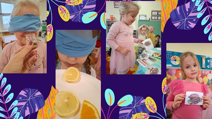 Dzieci z grupy „Różyczki” podczas zajęć z projektu Gramy zmysłami za pomocą węchu rozpoznawały różne...