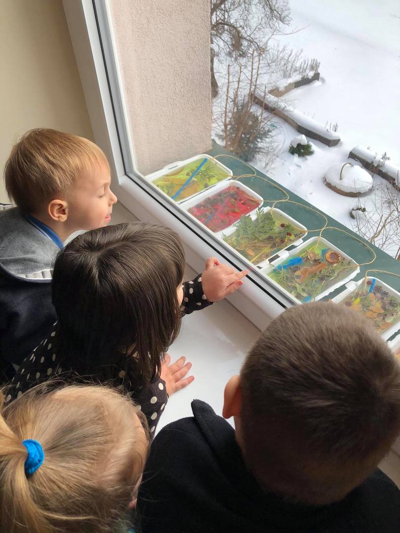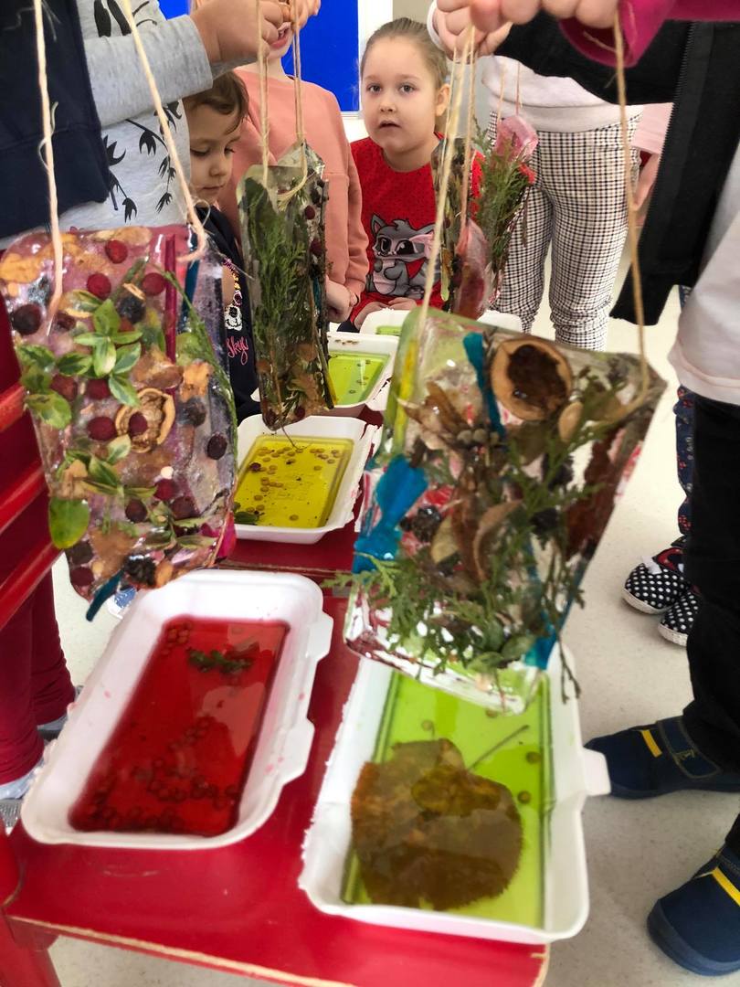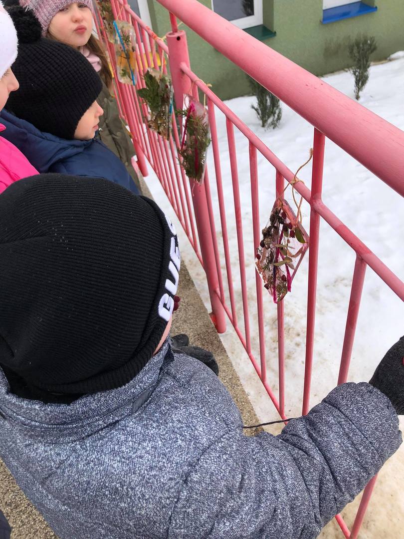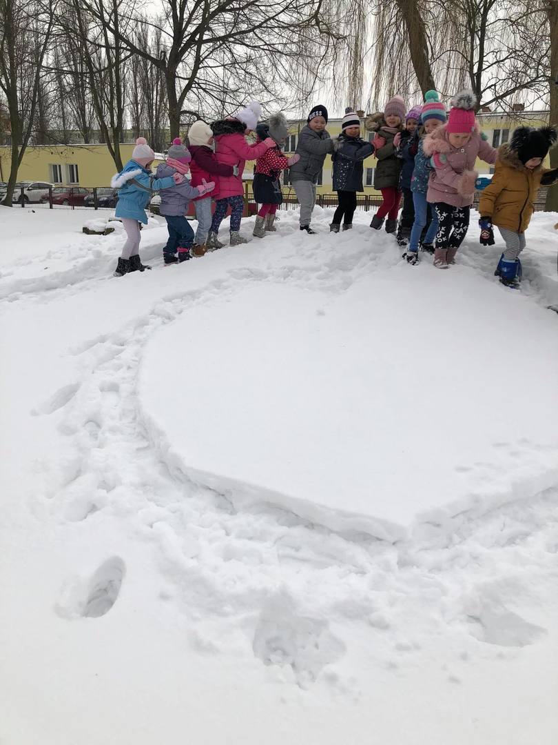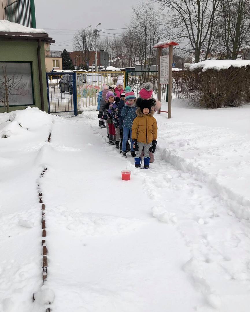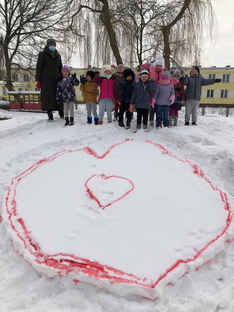 Przedszkolaki z zapałem uczestniczyły w zabawach badawczych, malowały walentynkowe serce dla kolegów na górce w przedszkolnym ogrodzie oraz „mural” na śniegowej ścianie – „Moje miasto Łapy”. Wszystkich zachwyciło tworzenie ekologicznych, lodowych „witraży”. Kolorowe wytwory pracy dzieci zdobią teren przedszkola … trochę szkoda, że tylko do czasu odwilży.