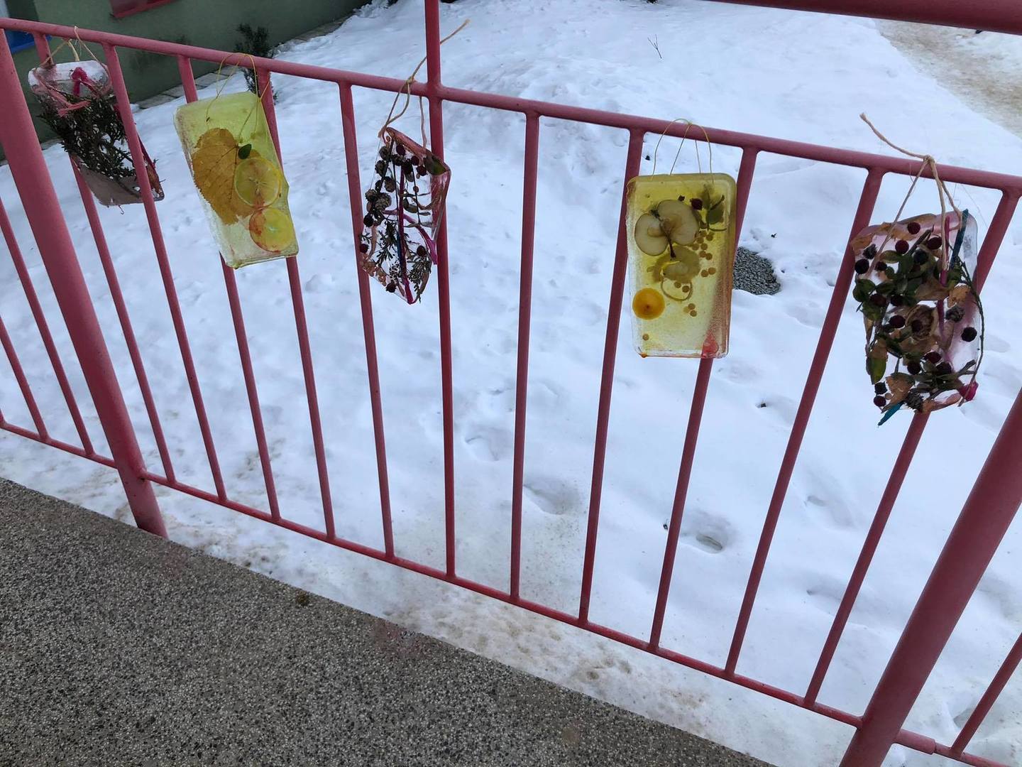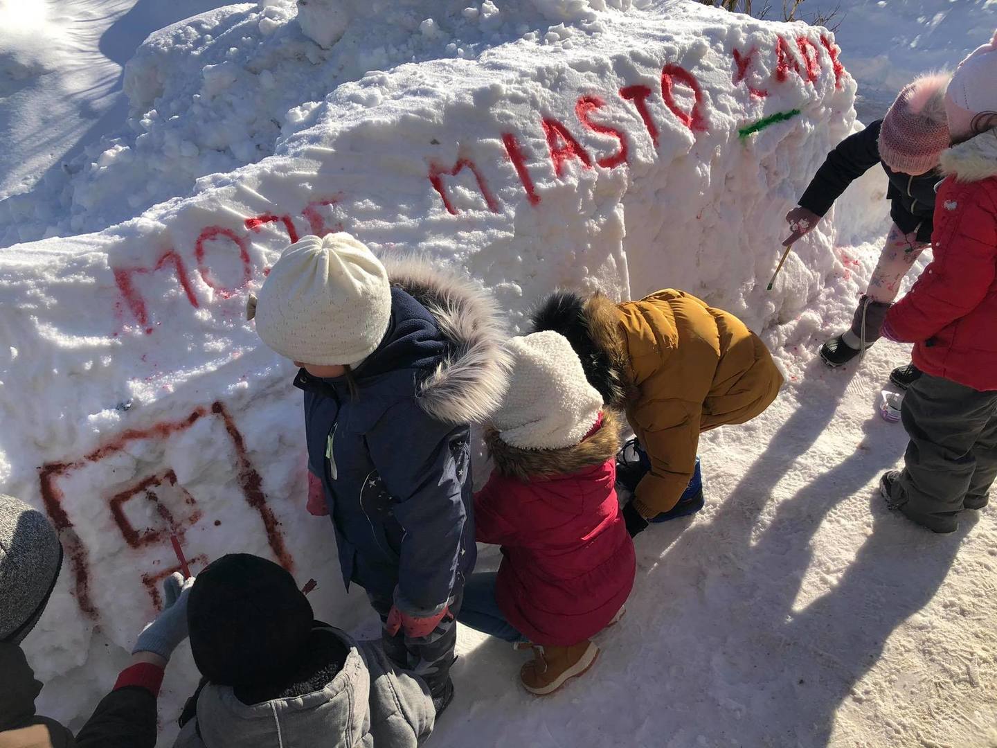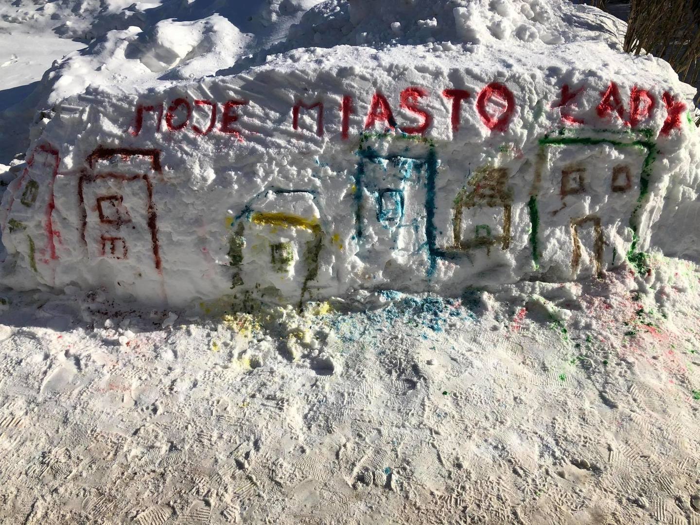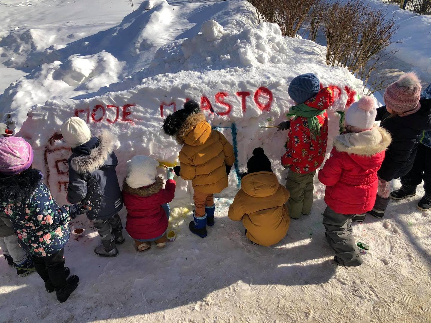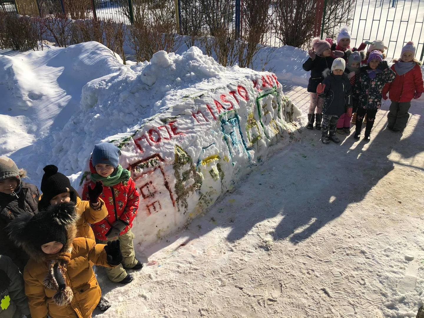 Przedszkolaki z zapałem uczestniczyły w zabawach badawczych, malowały walentynkowe serce dla kolegów na górce w przedszkolnym ogrodzie oraz „mural” na śniegowej ścianie – „Moje miasto Łapy”. Wszystkich zachwyciło tworzenie ekologicznych, lodowych „witraży”. Kolorowe wytwory pracy dzieci zdobią teren przedszkola … trochę szkoda, że tylko do czasu odwilży.