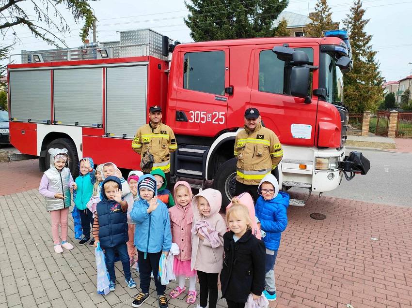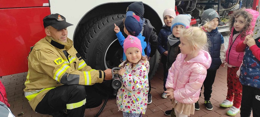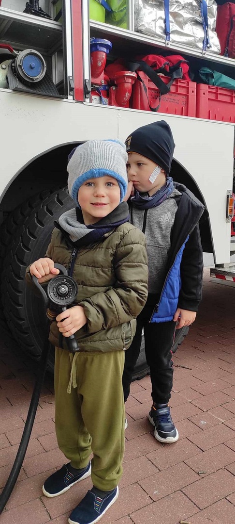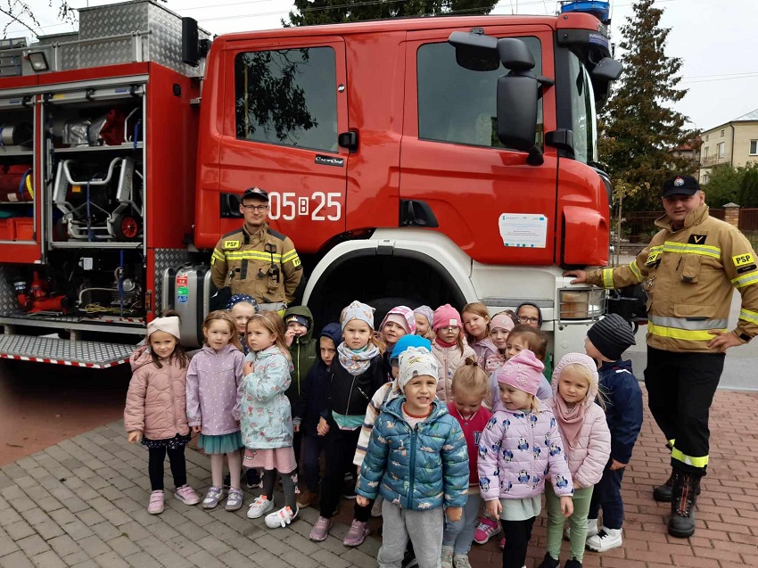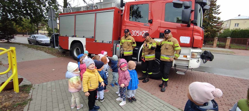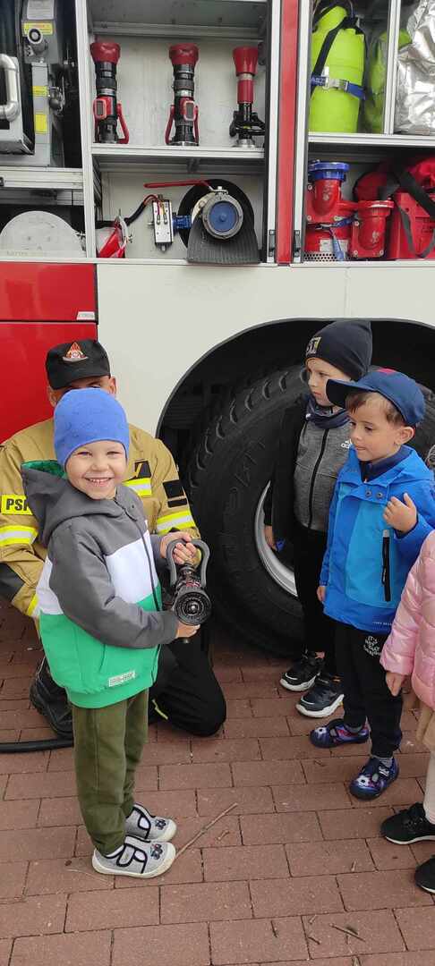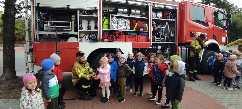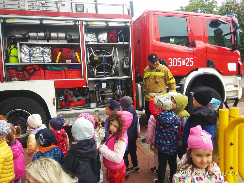 Dzięki uprzejmości strażaków dzieci miały także możliwość obejrzenia wyposażenia wozu strażackiego oraz zapoznały się z elementami ubioru strażaka.