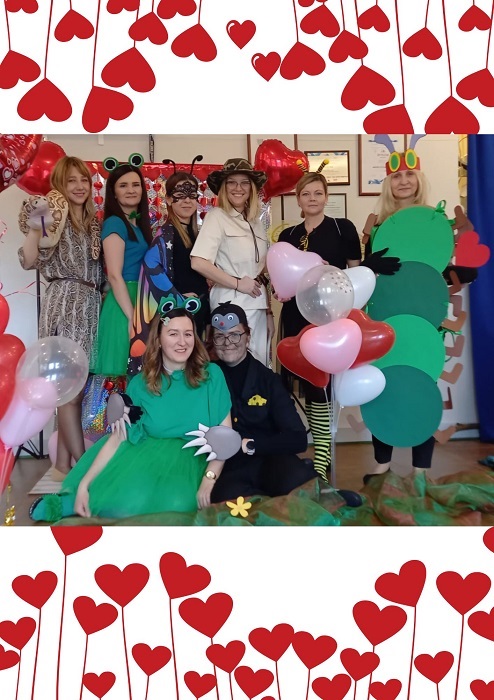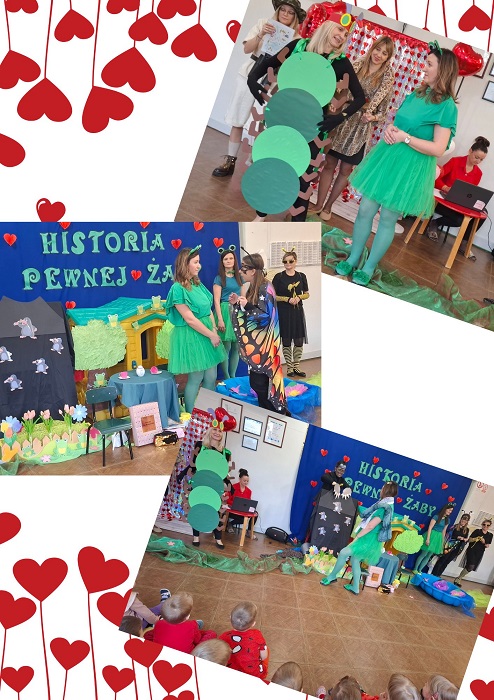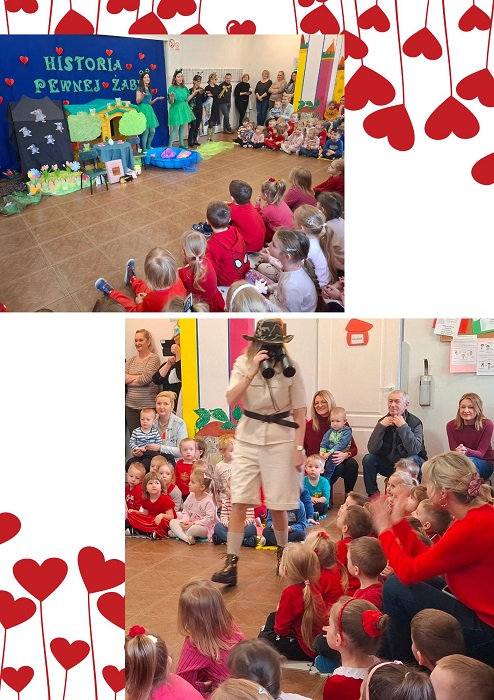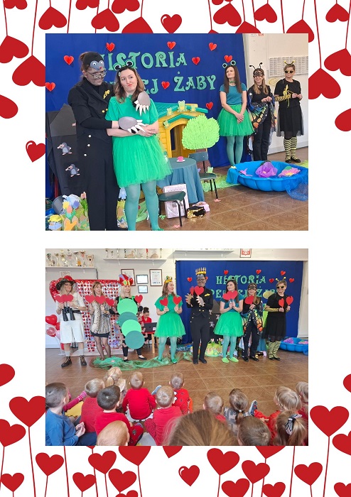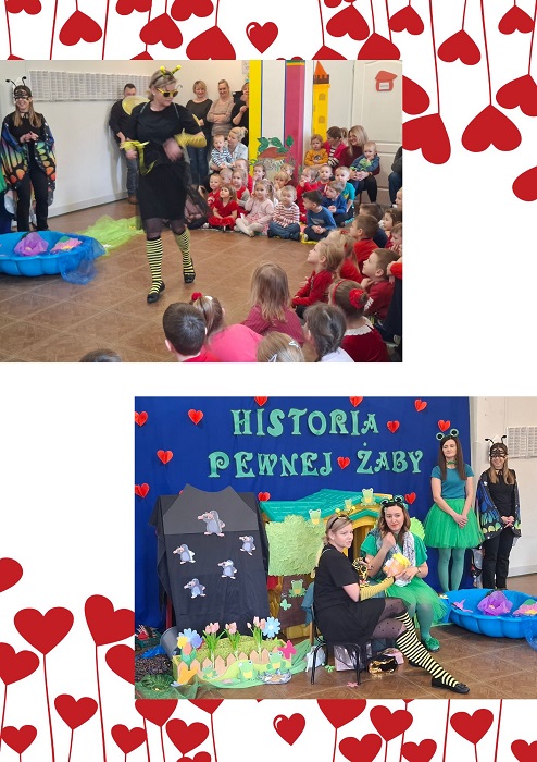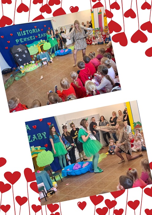 Główną atrakcją w tym dniu dla przedszkolaków było przedstawienie teatralne pt. „Historia pewnej żaby” przygotowane przez panie nauczycielki. Teatrzyk opowiadał oczywiście o historii miłosnej, o historii pewnej żaby zakochanej w krecie, który na początku odrzucał zaloty żaby. Nasza bohaterka bardzo się starała i cenne rady dotyczące kreta od swoich przyjaciół dostawała, jednak to wszystko nie przynosiło skutku. Aż do pewnego spotkania, kiedy to kret docenił starania żaby i wyznał jej również miłość. A następnie para zakochanych zaprosiła wszystkie przedszkolaki na przyjęcie zaręczynowe, podczas którego wszyscy tańczyli wesołe piosenki. W tak radosnym i miłosnym nastroju wszyscy przy walentynkowych rytmach rozeszli się do swoich sal, gdzie czekały na przedszkolaków kolejne niespodzianki - słodkie walentynki - batoniki z kolorową walentynkową zakładką oraz czerwone lizaki w kształcie serduszek.