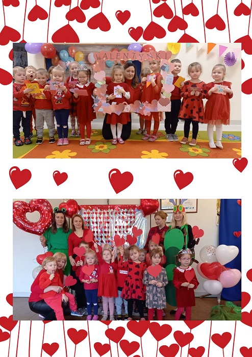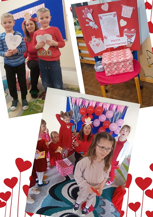 W piątek 14 lutego obchodziliśmy w naszym przedszkolu Walentynki. W tym dniu wszyscy byli ubrani na czerwono, a serca i serduszka papierowe czy pod postacią balonów królowały w przedszkolu. Był to dzień pełen atrakcji. Tydzień przed świętem zakochanych w przedszkolu zorganizowana została Poczta Walentynkowa. Przedszkolaki miały okazję wykonać własnoręczne kartki walentynkowe, które następnie można było umieścić w specjalnej skrzynce. Walentynki trafiły do swoich adresatów w dniu zakochanych, dostarczając przedszkolakom wielu radości.