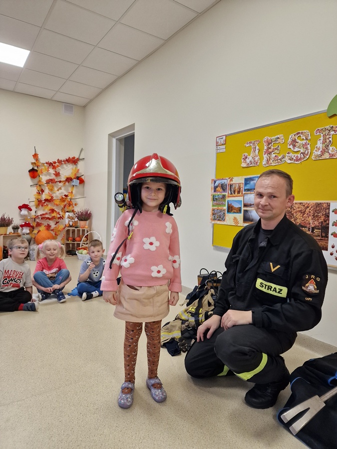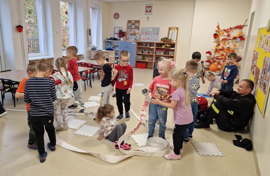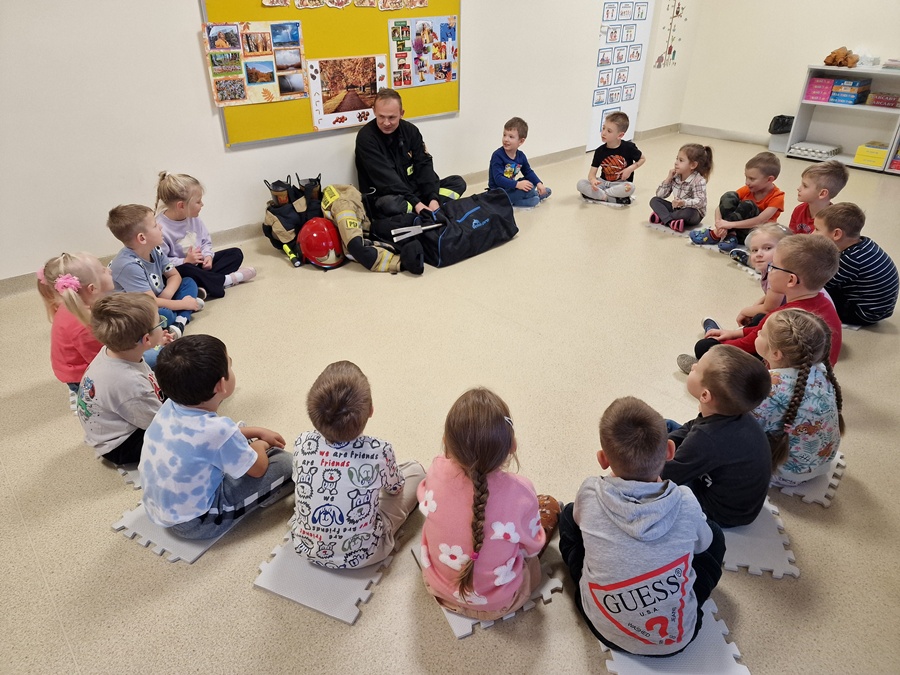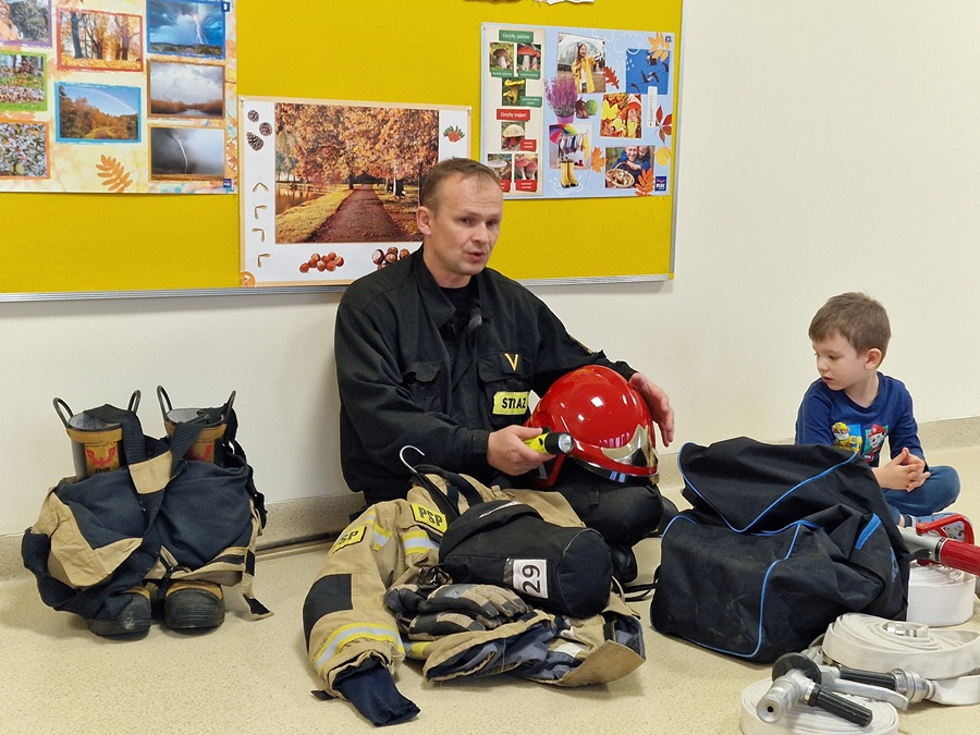 Podczas spotkania Pan Emil Zawadzki opowiedział dzieciom o swojej codziennej pracy, o tym, że jest ciężka i niebezpieczna ale bardzo potrzebna i dająca dużo satysfakcji. Dzieci dowiedziały się, że praca strażaka nie polega tylko na gaszeniu pożarów, ale również na udzielaniu pomocy ludziom podczas powodzi i wypadków samochodowych czy pomoc w zdejmowaniu kotów z drzew. Dzieci miały możliwość podziwiać strój i niektóre przedmioty jakimi dysponuje strażak podczas swojej pracy. Na zakończenie spotkania Pan Emil przeczytał dzieciom bajkę pt: „Strażak Pies ratuje owieczki z opresji”.